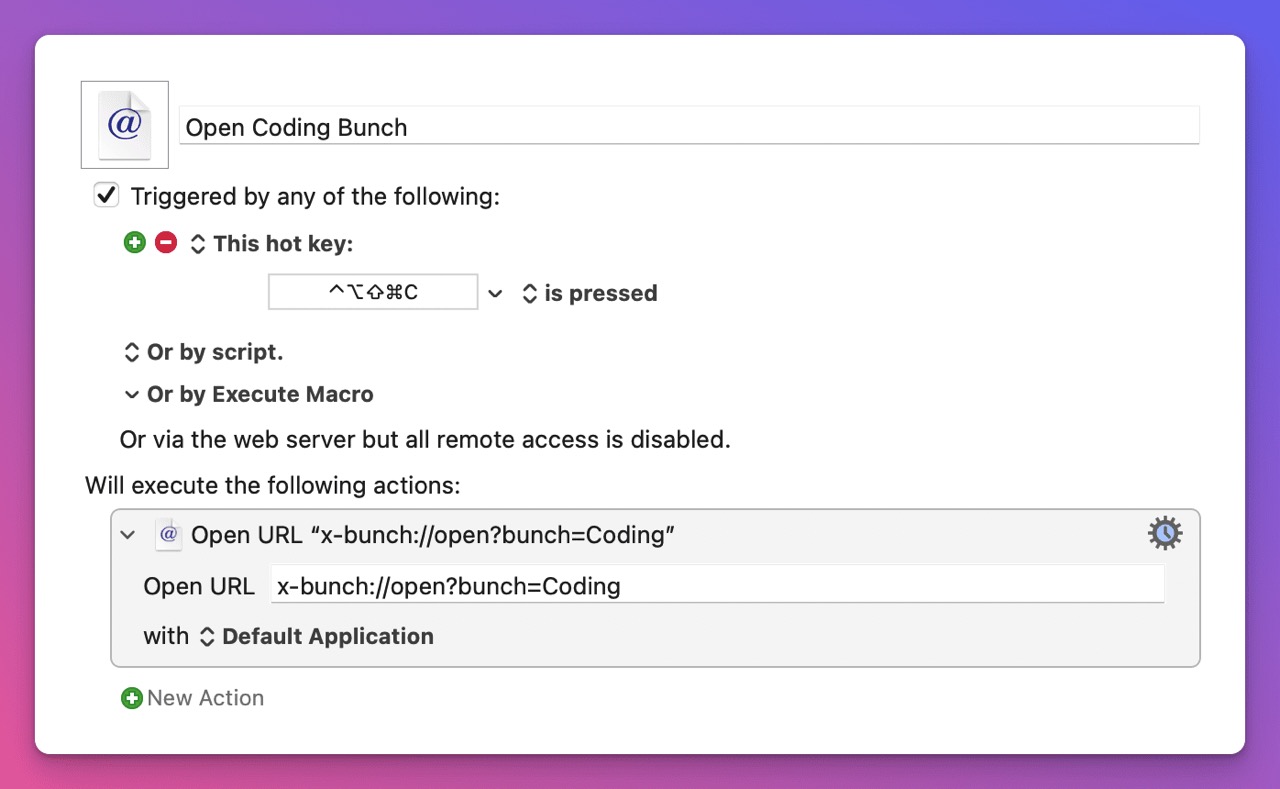 I chose to set up a hotkey in Keyboard Maestro that will open x-bunch://open?bunch=Coding when I press shift-control-option-command-C. Here’s what the macro looks like:
