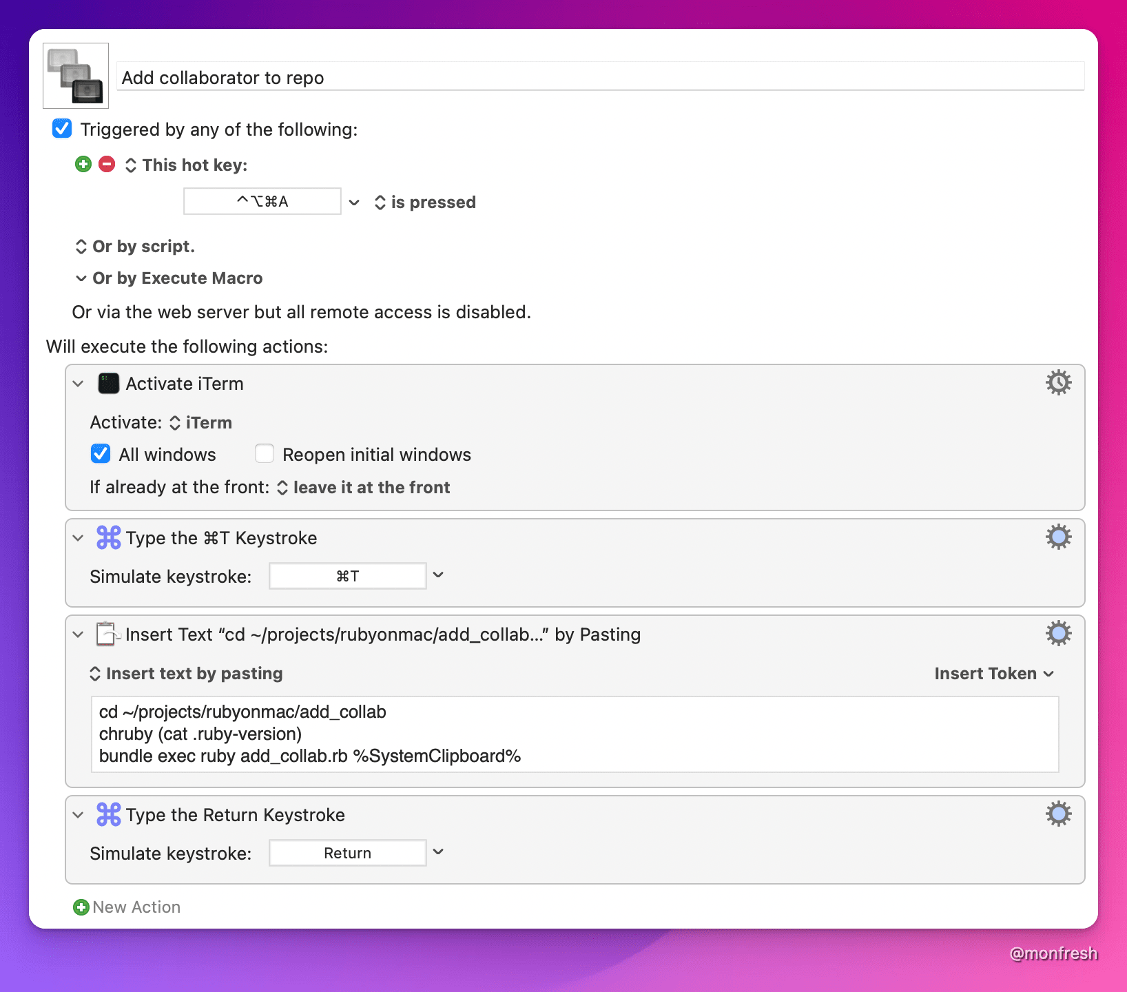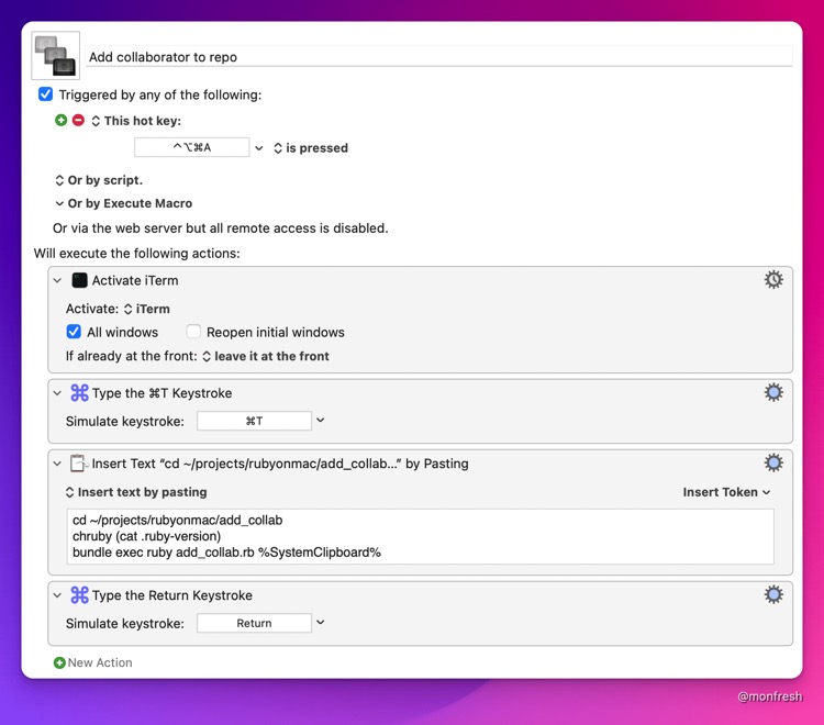 While you can run scripts directly in Keyboard Maestro, I chose to run the script from the project folder in iTerm because the octokit gem is already installed there. Here’s what the add_collab.rb file looks like: