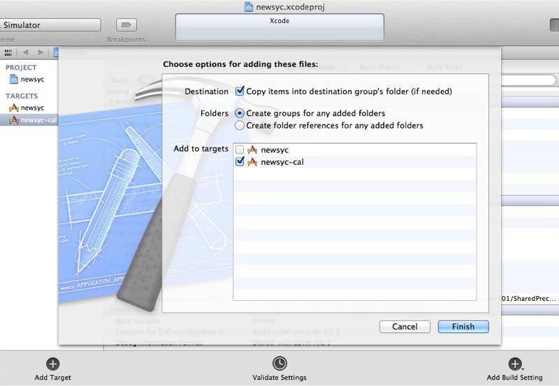 Click Finish, then click on the newsyc-cal target, click on Build Phases, expand Link Binary with Libraries, click on +, click on CFNetwork.framework, and click on Add. You should end up with something very similar to this: