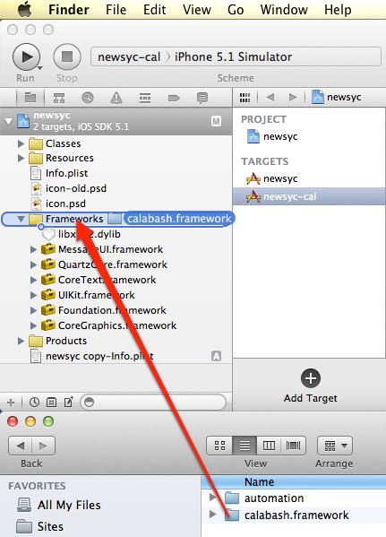 Once you drop the calabash.framework folder in Xcode, you will be prompted to “choose options for adding these files”. Make sure the following are true: Copy items into destination group's folder (if needed) is checked, Create groups for any added folders is selected, and only your newly-created target (in our case newsyc-cal) is checked, as shown in this screenshot: