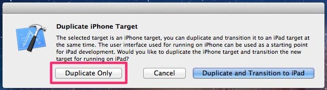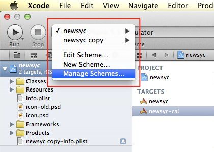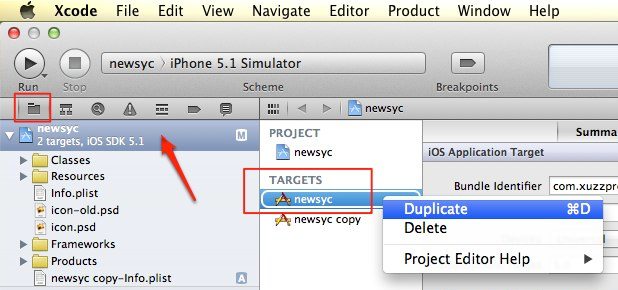 Click on the newsyc project in the leftmost pane, then right-click (or two-finger tap) on newsyc under TARGETS, and select Duplicate. Or, simply click on newsyc and press ⌘D. If you get a Duplicate iPhone Target prompt, click on the Duplicate Only button.