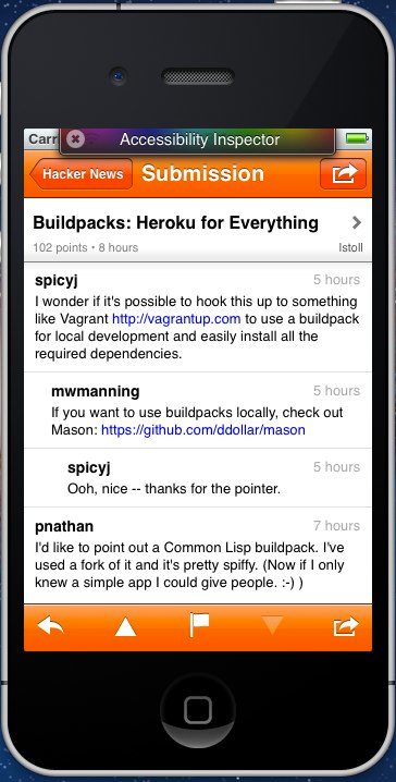 As mentioned in the Getting started guide, one of the ways Calabash finds UI elements is via their accessibility labels. Let’s run the newsyc-cal target in the iOS Simulator (as explained in Step 5) with the Accessibility Inspector turned on and collapsed. Tap on any entry on the Home tab, then expand the Inspector. Now tap any of the comments. If the Inspector doesn’t highlight the entire comment cell, and if it thinks each comment is a Button with the Label “reply”, it means that the cell does not have an accessibility label, which means Calabash can’t read any of the text inside the comment cells. We can solve that problem by setting an accessibility label programmatically in Xcode.1