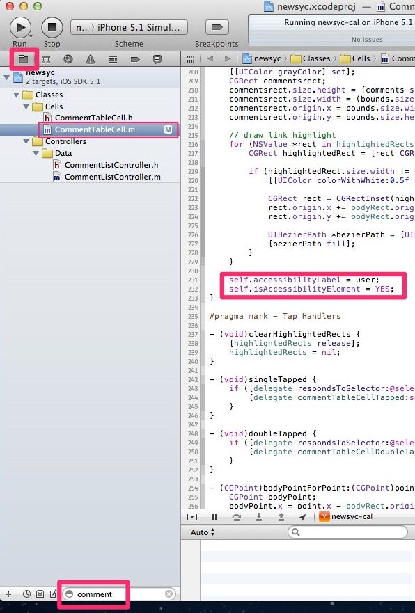 Now that we know which Class we need to modify, let’s go find it in Xcode. Click on the folder icon in the top left (under the Run button), type comment in the search field at the bottom left, then click on CommentTableCell.m in the file list. Type in the following code on lines 231 and 232 of CommentTableCell.m: