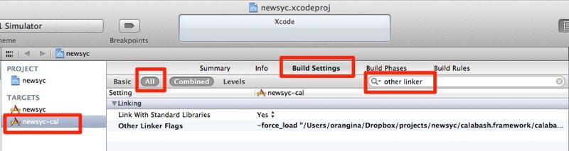 With the newsyc-cal target still selected, click on Build Settings, click on All (if it’s not already selected), then search for other linker, click on the Other Linker Flags row, then click once under Yes to enable edit mode, and copy and paste the following: -force_load "$(SRCROOT)/calabash.framework/calabash" -lstdc++. Click anywhere outside of the text field to save your changes. You should end up with something like this (note that what appears after -force_load will be different for you since that is the path to your project on your computer):