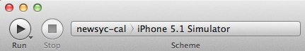 In the Scheme dropdown in the top left (to the right of the “Stop” button), select the newsyc-cal target on the left side of the dropdown, select iPhone 5.1 Simulator on the right side of the dropdown, then click the Run button (or press ⌘R).