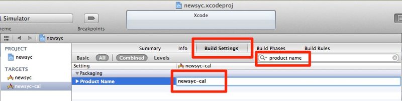 Click OK, then click on Build Settings in the center pane, search for “product name”, then double-click on newsyc copy and rename it to newsyc-cal: